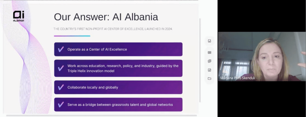 To close the session, Dr. Marjana Prifti Skenduli, a postdoctoral researcher in quantum AI/ML and founder of AI Albania, introduced the institute’s mission to connect Albania with global research and industry trends in artificial intelligence.