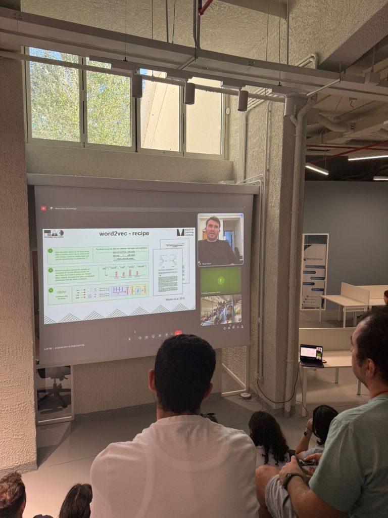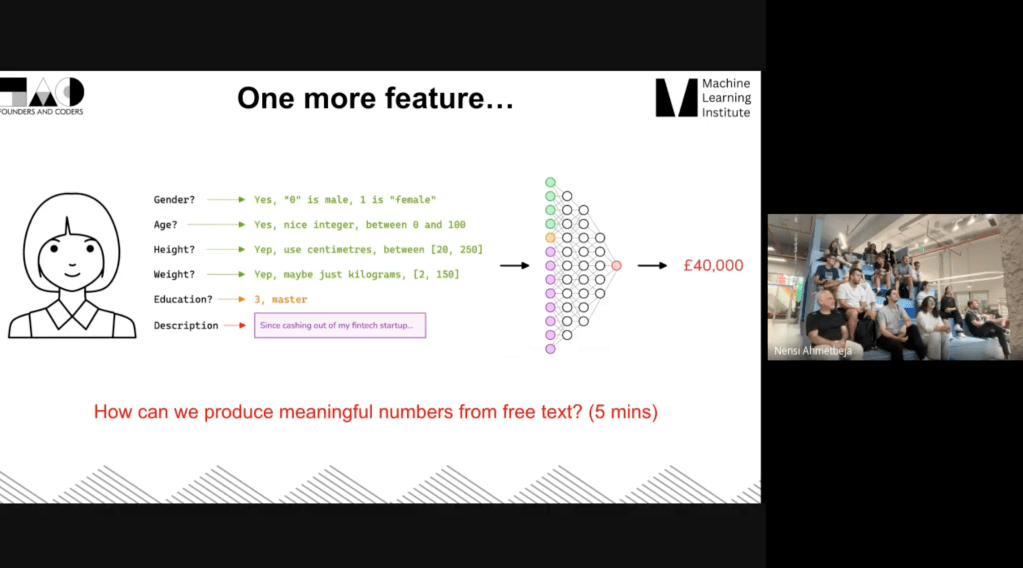 When the timer went off, Besart listened, inviting people to speak up before breaking down how embeddings and Word2Vec work.